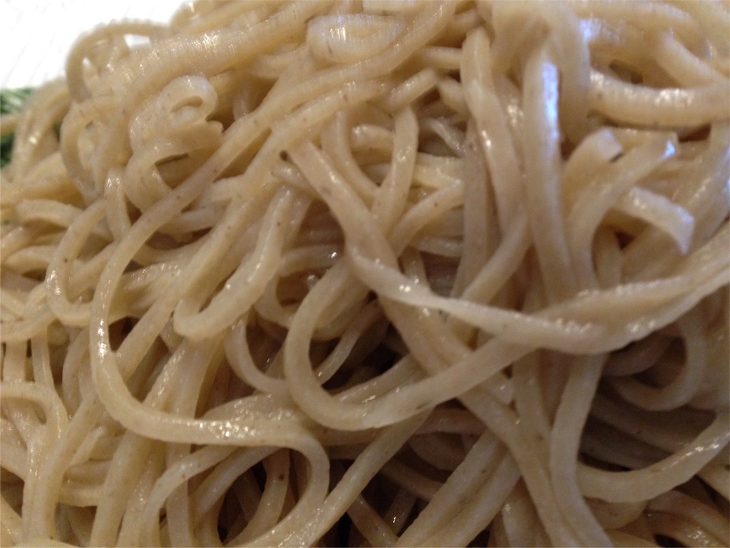 如何にも寒晒しであると主張する0.9mm程度のピシッと締まった麺、瑞々しく美しく食感が良い。秋に収穫した新蕎麦を大寒(2月)を迎えた厳冬期に霊峰・月山の湧き水に3週間浸してアクを抜き寒風に晒して天日干しをしたでわかおりの石臼挽き・二八と一部評にあるが、蕎麦そのものの味が良いので何も付けない水蕎麦の状態で食べるのが一番美味く感じる。